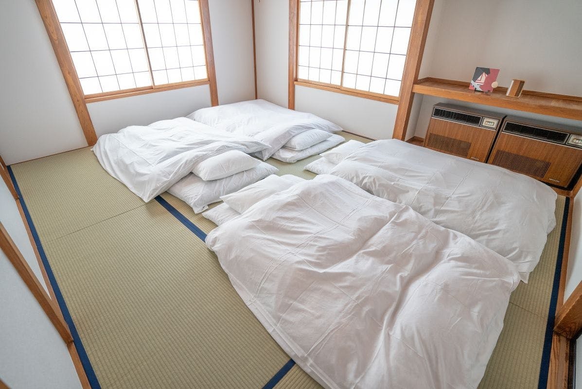 # There are no beds in the washi-mat rooms. Futons (cloths) are placed in the closet. Place the mats on the tatami mats, topped with a sheet, and then covered with a quilt.
